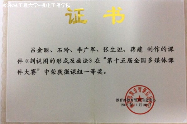 机电学院吕金丽等教师《剖视图的形成及画法》获得微课组一等奖;庄严等教师《网页设计课程教学资源网》获得高教工科组二等奖;张忠林等教师《特种加工技术》获得高教工科组三等奖。