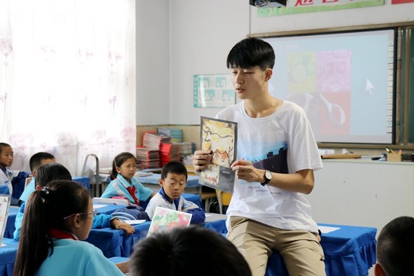 丁明轩先向同学们讲解了基础的绘画方法,并展示了一些实践队员们优秀的绘画作品,让同学们选出自己喜欢的作品,分享自己的喜欢的理由;随后,丁明轩也向同学们分享了自己喜欢的一幅作品和喜欢它的原因。实践队队员们向同学们分发了笔纸,让同学们展开想象,利用小课堂学到的知识自由发挥创作,或是尝试着模仿自己喜欢的作品。在课堂结束前,大家纷纷画出了自己的作品并和大家一起进行了分享。