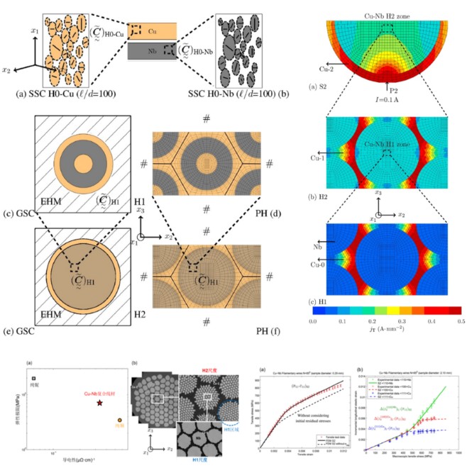 聚变能源具有清洁、安全、资源丰富等特点,是符合联合国能源可持续发展观念与“碳中和”科技创新目标的未来理想能源。国际热核聚变实验堆(ITER)将首次建成能与未来实用聚变堆规模相比拟的受控热核聚变实验堆,探索实现聚变电站的关键技术问题。兼具高强度和高导电性,Cu-Nb类复合线材是ITER的核心装置超导磁体系统导线目前唯一可用材料。课题组成员与巴黎文理综合大学合作,使用多尺度-多物理建模建立了Cu-Nb复合线材细观特征结构与其宏观物理性能的联系,并将模型预测结果与实验进行了对比验证,证明了所建立模型的预测能力。利用材料设计思想,课题组成员证明了通过材料微观结构参数优化,Cu-Nb复合线材的力学和电学性能仍可提高30%左右。现已发表中科院一区TOP期刊论文3篇,中科院二区论文2篇。