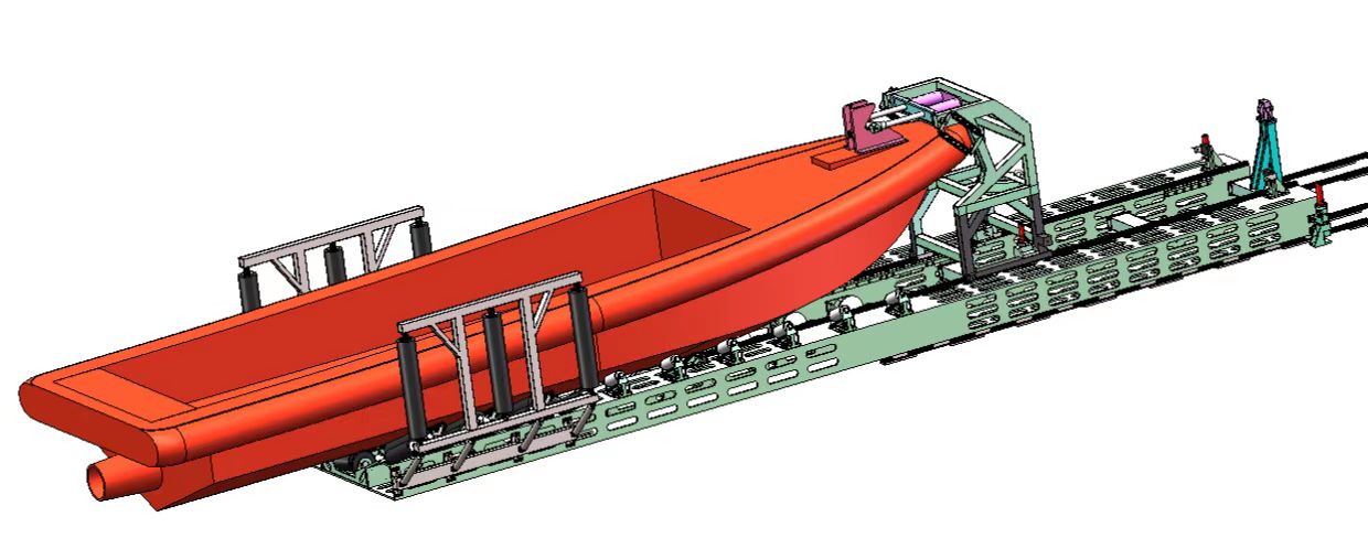 高速小艇是大型舰船巡逻护航及民用船只海上作业时不可或缺的设备,具有体积小、速度快、灵活等特点。大型舰船一般需配备1-2条高速小艇作为工作艇,以弥补大型舰船无法在浅水或狭窄水域内执行任务的不足。考虑到收放速度及海况适应能力的要求,本团队设计了一种滑道可伸缩式的艉滑道小艇收放装置,以满足复杂海况与对接位置的要求。