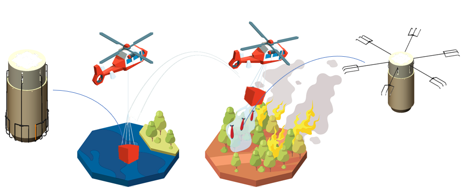 针对以树冠火为主的重特大森林火灾扑救这一世界性难题,本团队研发了智能森林灭火航弹及其直升机专用挂载投放系统。航弹具有精准自动寻的、智能感应起爆、药剂均匀弥散、绿色生态扑消和灭火性能高效等特点;利用直升机专用挂载投放系统,能够实现从火场上方或远距离投放灭火航弹,对树冠火实施扑消,保证灭火剂在树冠火燃烧场内部充分弥散;借助直升机运载的高机动性特点,能对远距离大面积树冠火实施快速反应与压制性扑消。