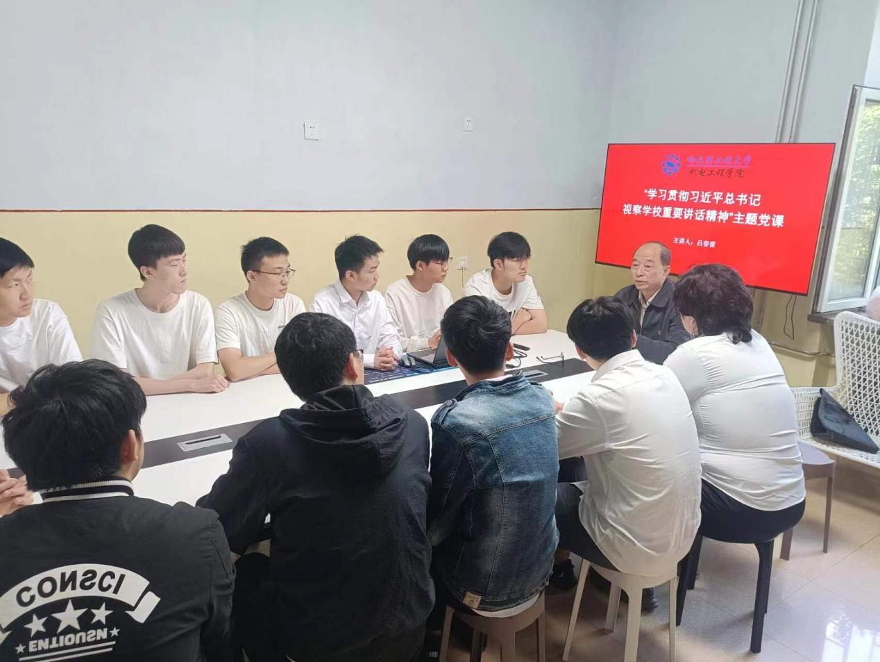 2023年9月28日上午,机电学院党委书记吕春雷到三公寓学生社区党建活动室做主题党课,学习宣传贯彻习近平总书记视察学校重要讲话精神。学生代表参会。