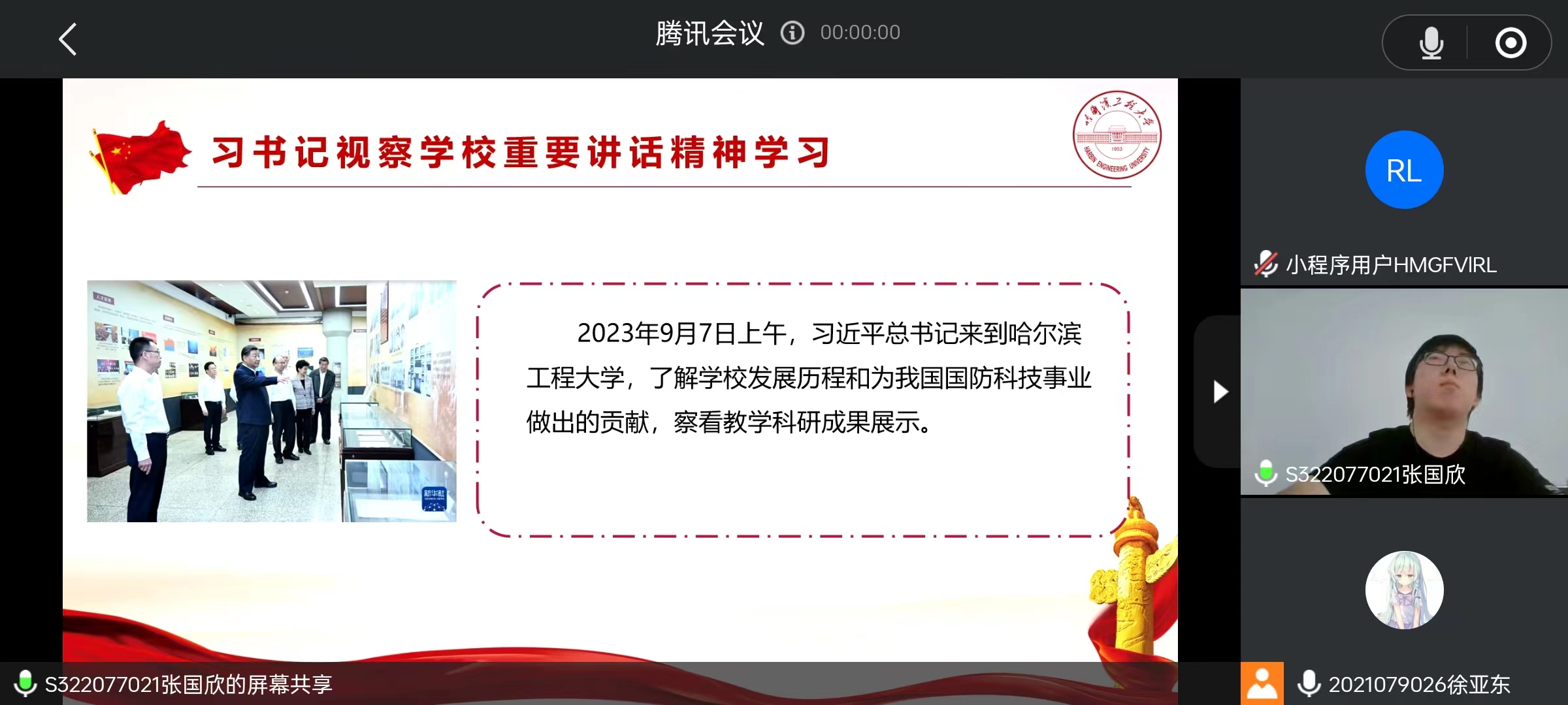 本科生第一党支部徐亚东结合学业生涯规划,宣讲习近平总书记视察365上市公司重要讲话精神。首先,他给出了学生生涯规划的建议。之后,他号召学弟学妹们珍惜时间,最后,他强调:作为哈军工传人,我们要牢记习总书记嘱托,努力学习,刻苦钻研,不忘初心,砥砺前行,让青春在全面建设社会主义现代化国家的火热实践中绽放绚丽火花!
