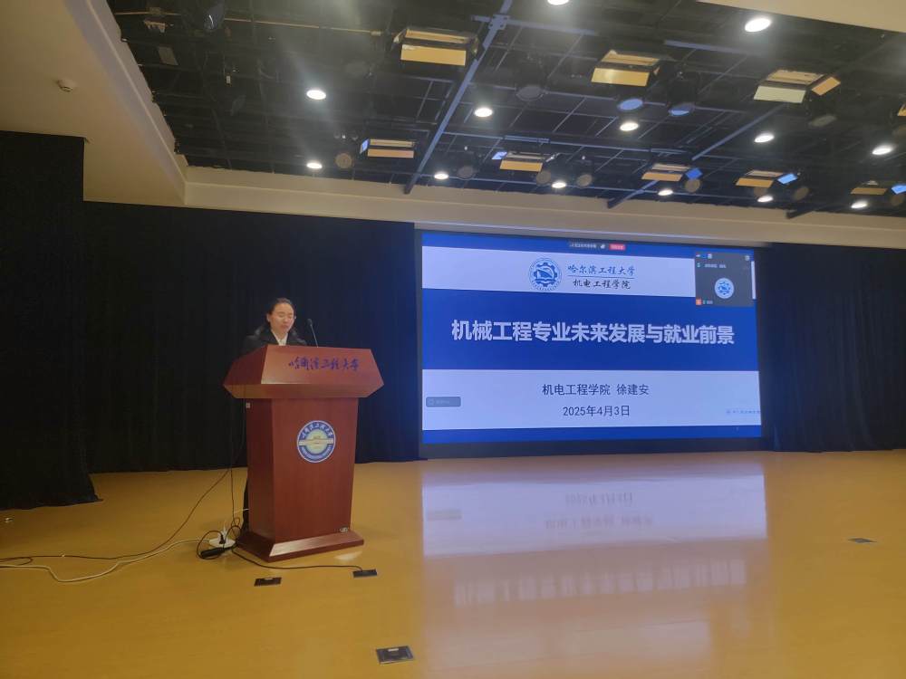 首先,徐建安院长向参会的同学们做了题为《机械工程专业未来发展与就业前景》的讲座,分别从机械工程专业简介、机械工程服务领域、机械专业与中国智造、机械专业就业前景四个方面进行了介绍。徐院长强调,作为一所以海洋与国防为特色的高校,肩负着服务国家装备制造和海洋科技发展的光荣使命。哈军工的优良传统为我们积淀了深厚的军工底蕴,多年来培养的毕业生以“可靠顶用、拔尖创新”的鲜明特质,赢得了国防科研院所和高端装备制造单位的高度认可。他勉励同学们要珍惜学习时光,勇攀科技高峰,以实际行动投身海洋强国建设,为打造国之重器贡献青春力量!